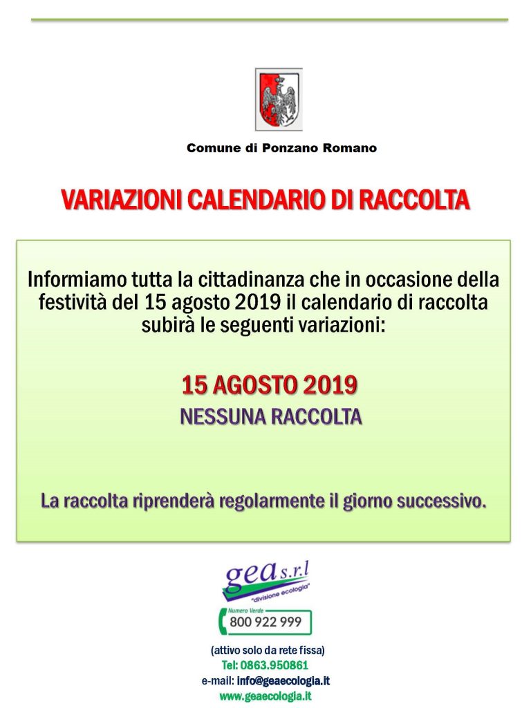 Comunicazione di variazione calendario di raccolta in occasione del 15 agosto 2019: nessuna raccolta.